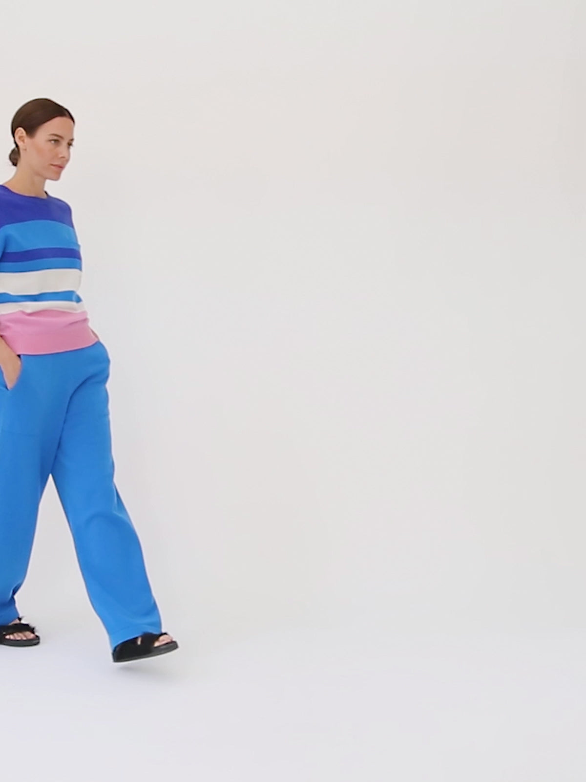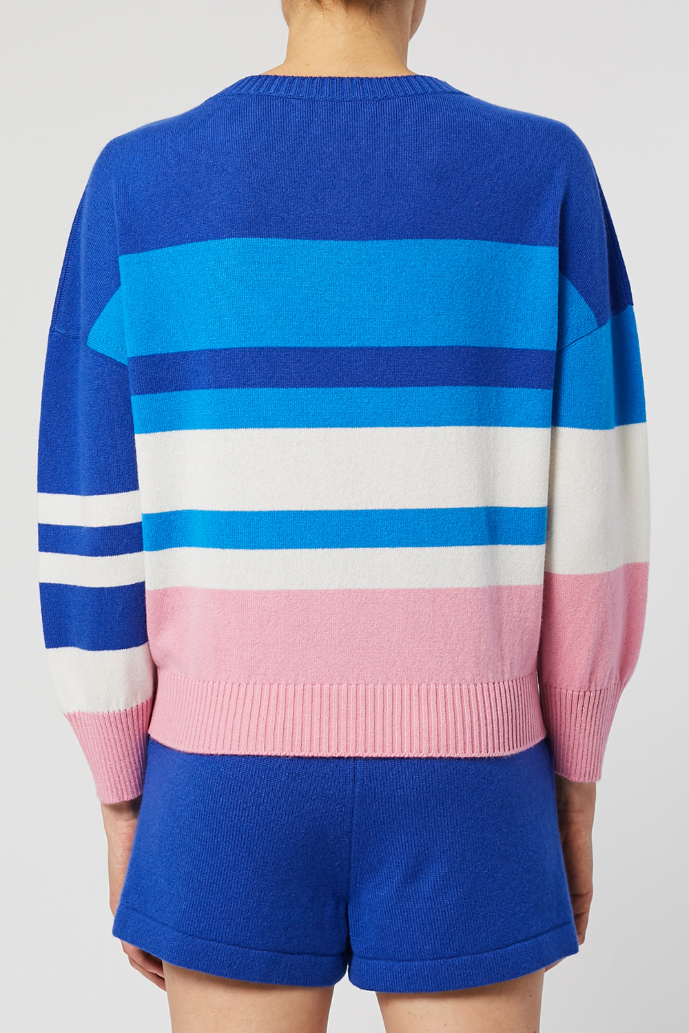 Inspired by Varsity t-shirts and America football jerseys,College is their latest masterclass: ‘stretched’ crew neck, asymmetric stripes unexpectedly balanced, perfect loose proportions, in lightweight cashmere.