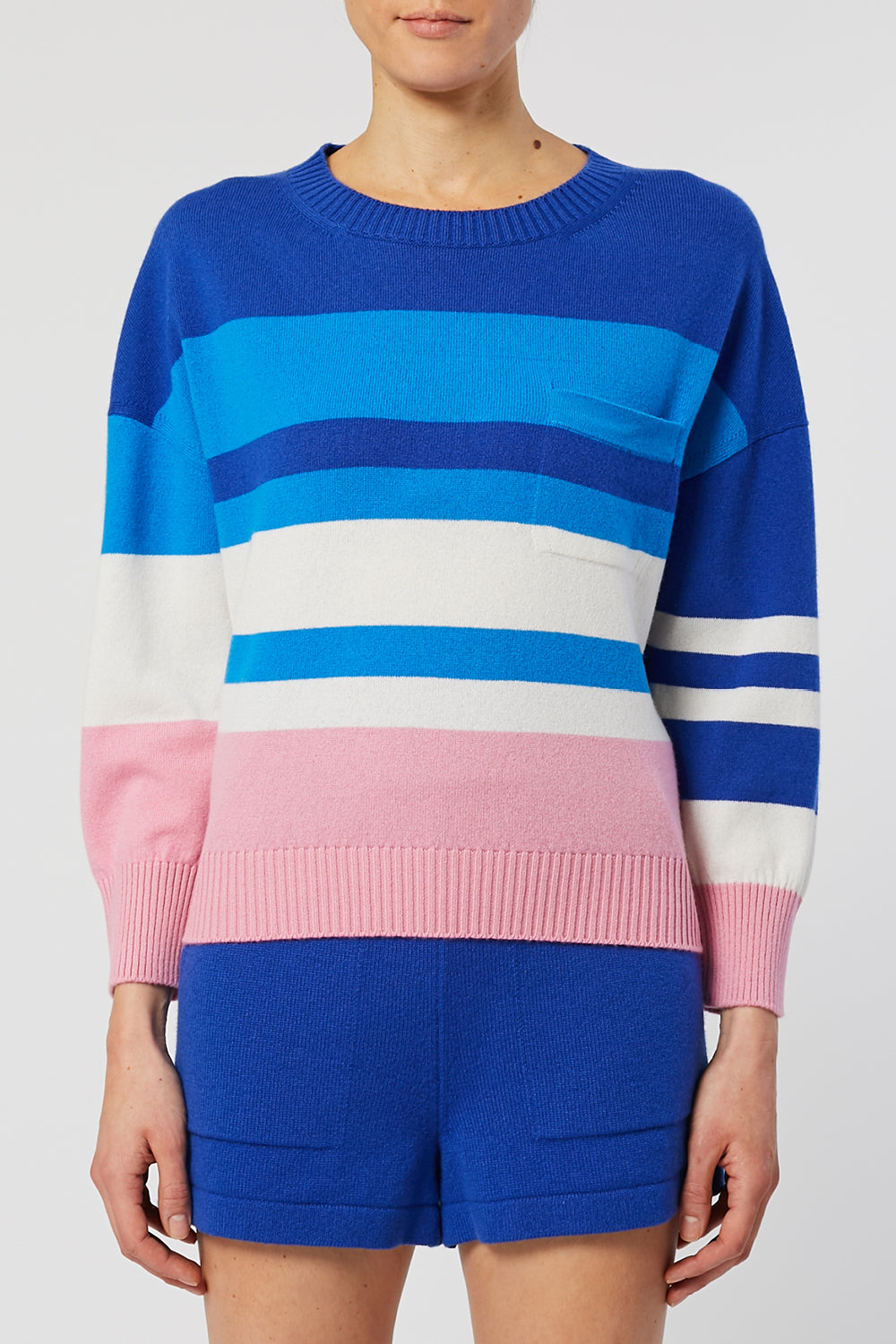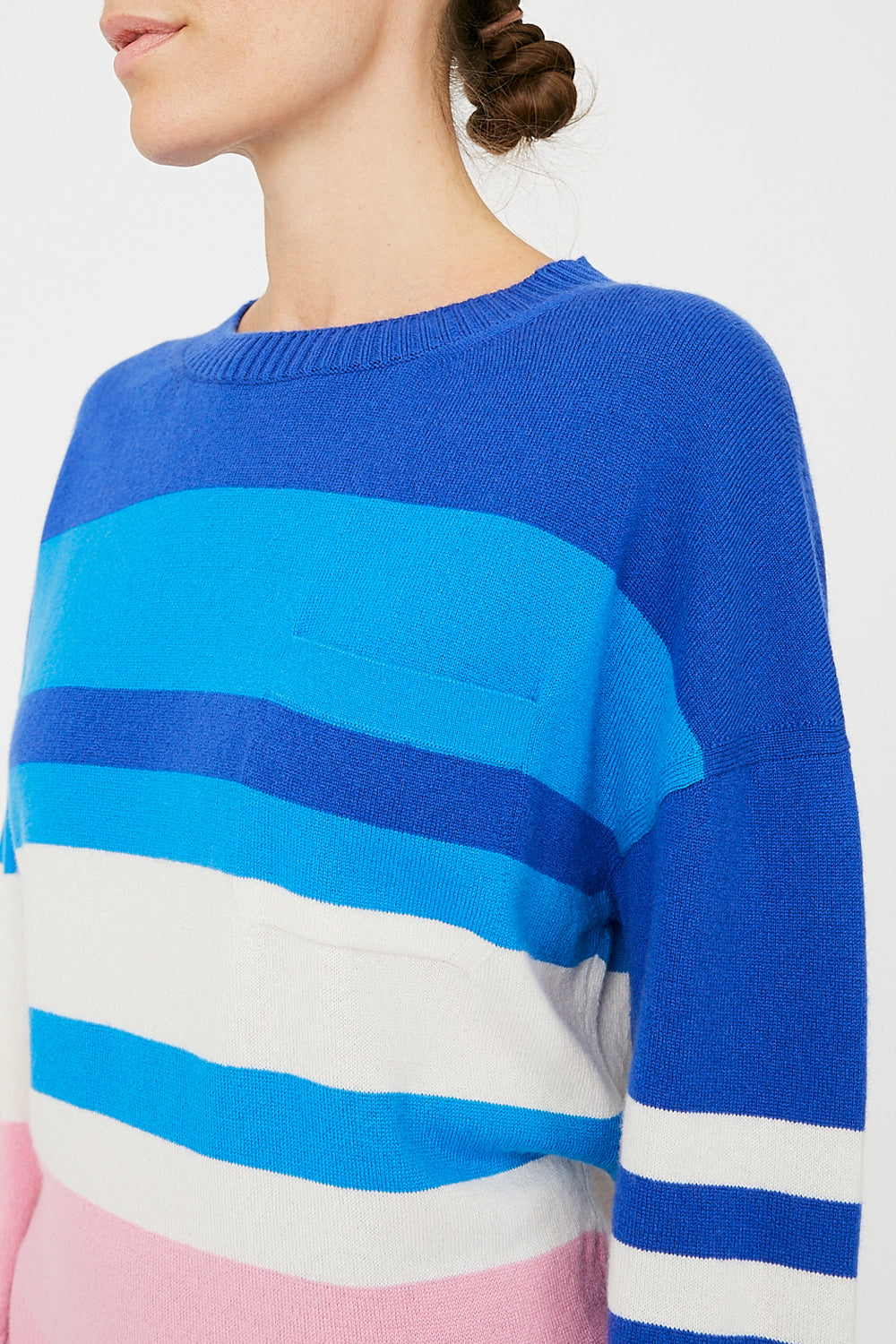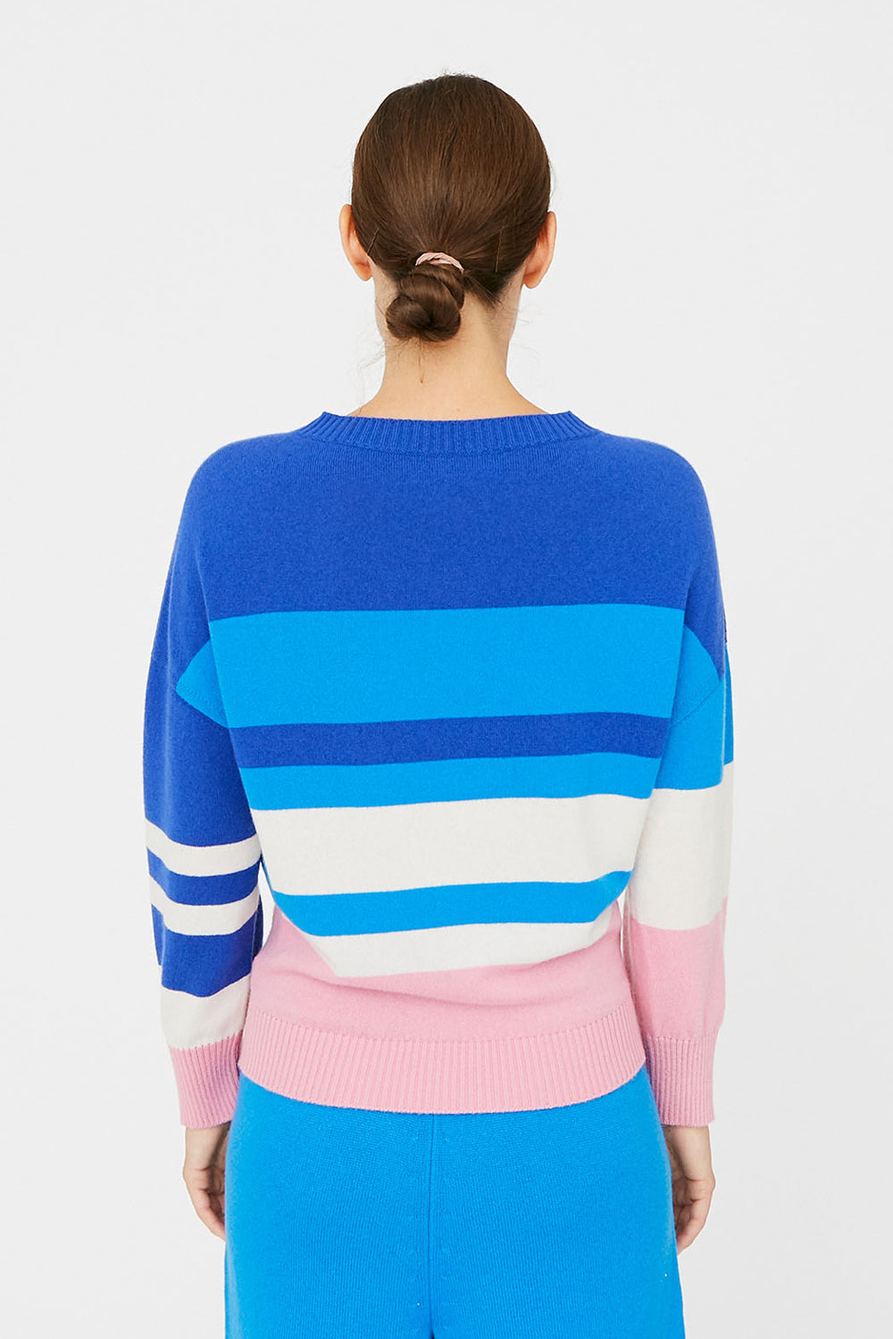 – College is cut generously, has dropped shoulders and ‘bracelet length’ sleeves (ending on the wrist bone), in lightweight cashmere in shades of pink, blue and white.