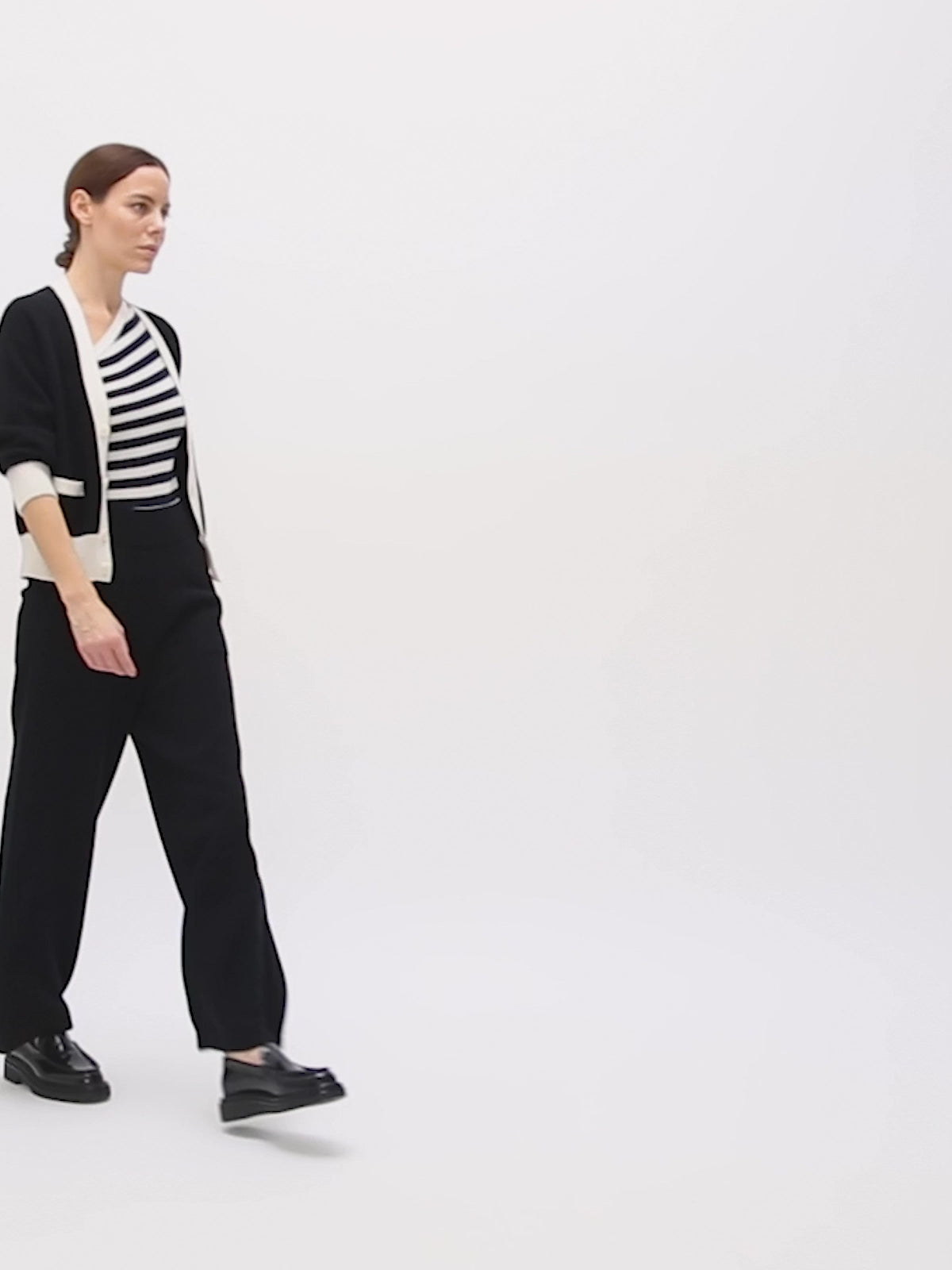 Short cardigan in pure Scottish cashmere. Mid-weight (2-ply), with ivory contrast trims, cuffs and hem. Dropped shoulders, cuff-length sleeves.