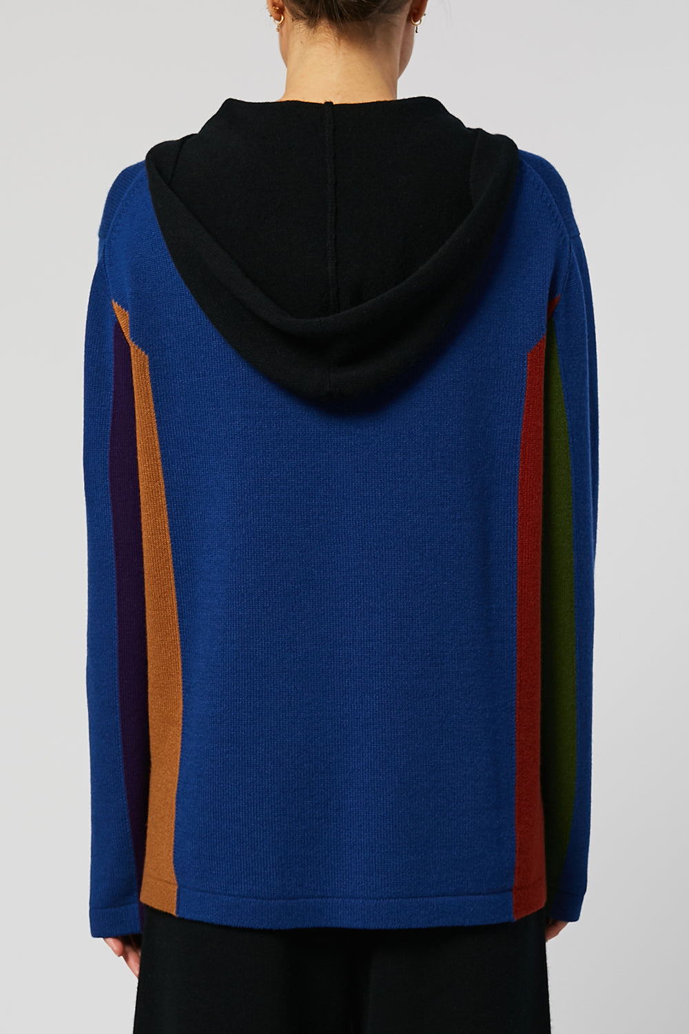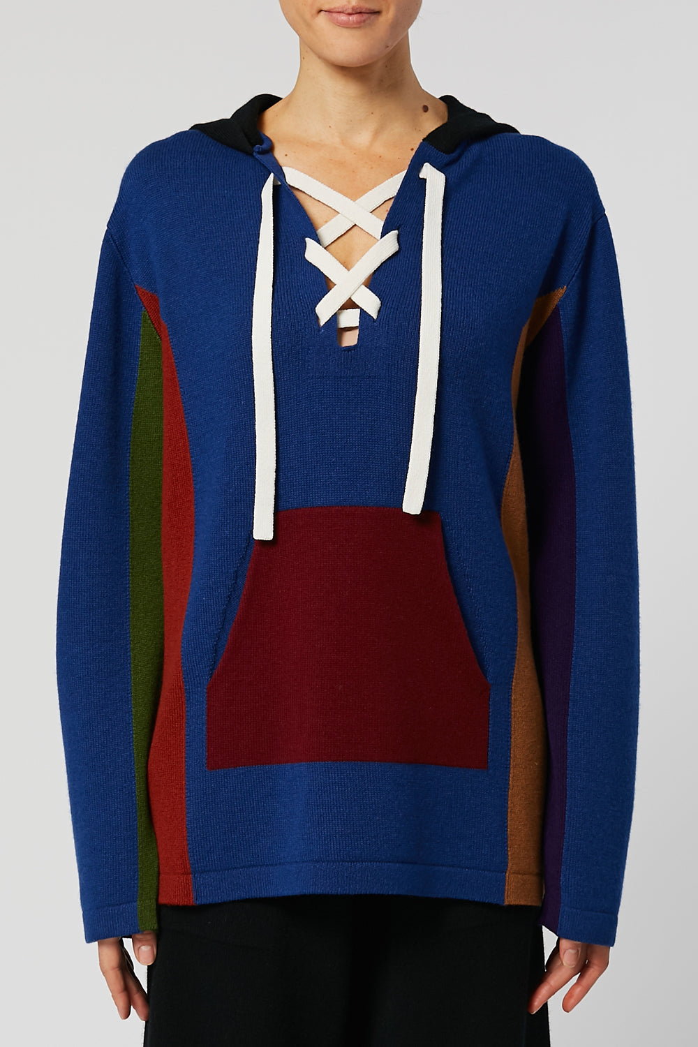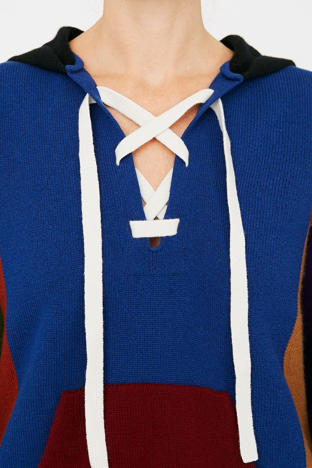 Hooded sweater tunic in colour-block panels combining dark and neutral tones. Lace-up neckline, integrated pouch pocket and side slits. Knitted in mid-weight cashmere (2-ply), it is the ultimate statement sweater, with all the ease of a sweatshirt but luxuriously executed and coloured.