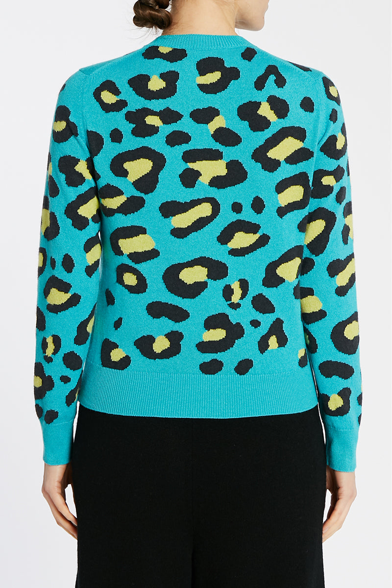 Our classic cardigan with an all-over leopard hand intarsia, lovingly and expertly crafted by our experts at Barrie knitwear in Scotland
