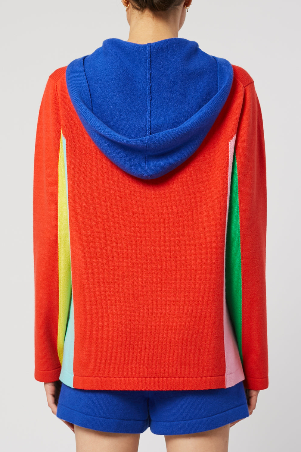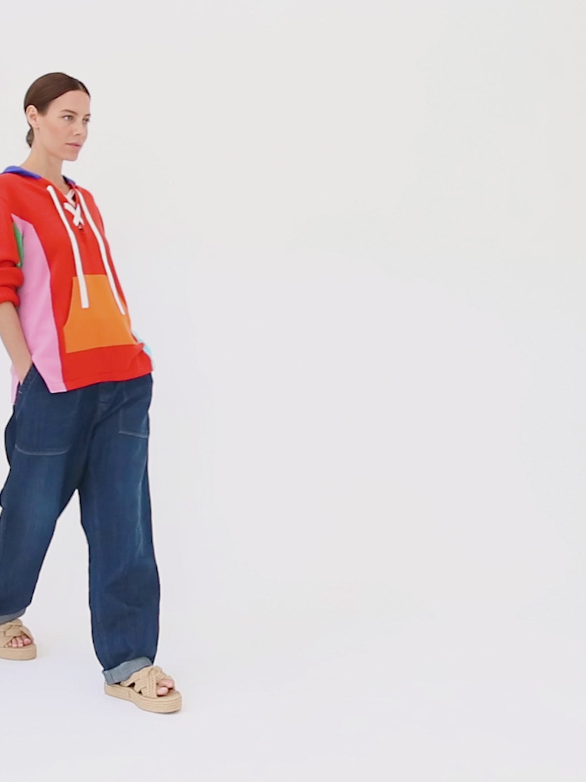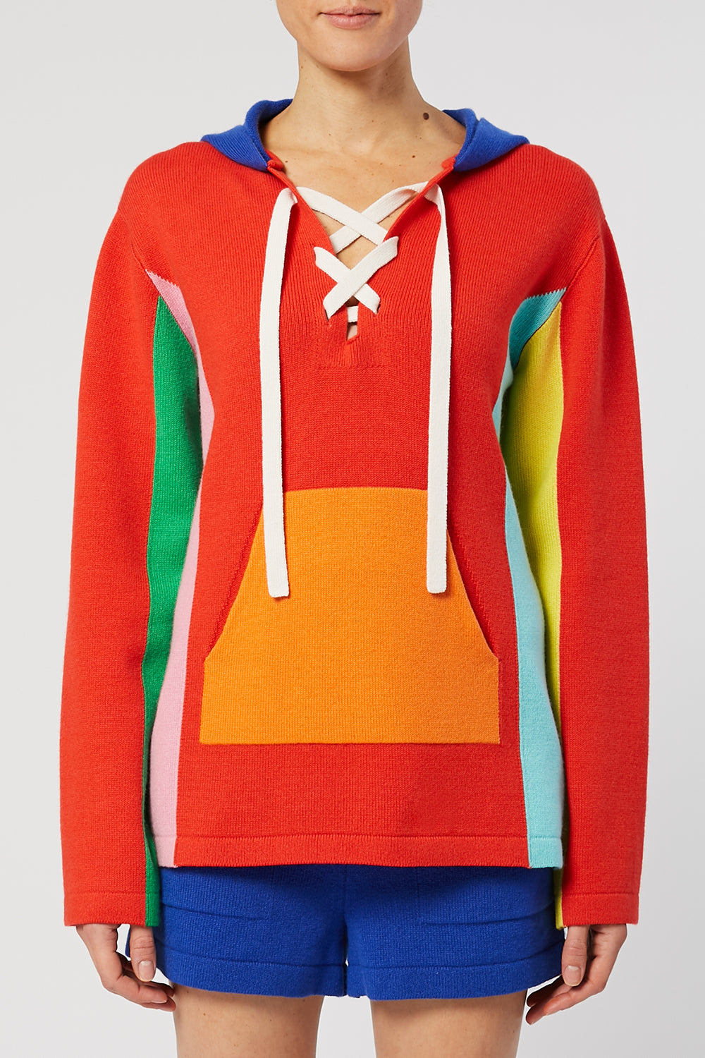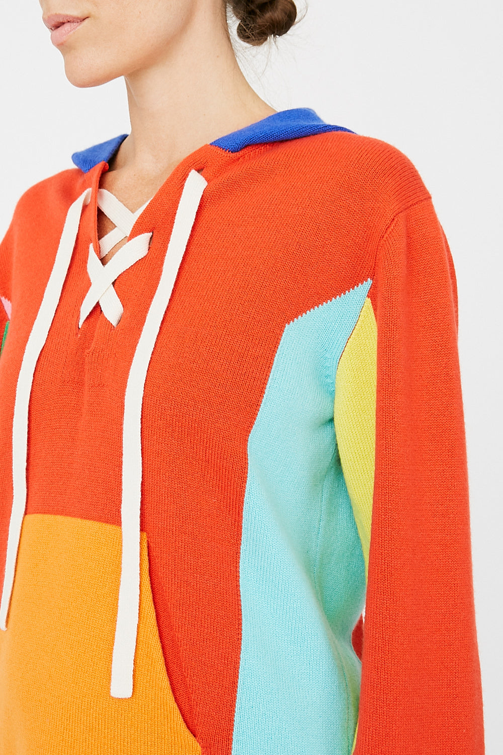 Hooded sweater tunic, in bright colour-block panels, lace-up neckline, integrated pouch pocket and side slits.