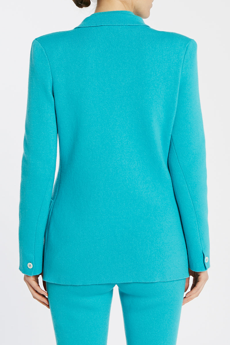 Our cashmere blazer, knitted in interlock stitch laced with elastane for a compact fit that allows it to be neatly 'tailored' with perfect clean edges. Sharp like a tailored jacket. but comfortable like a cardigan.
