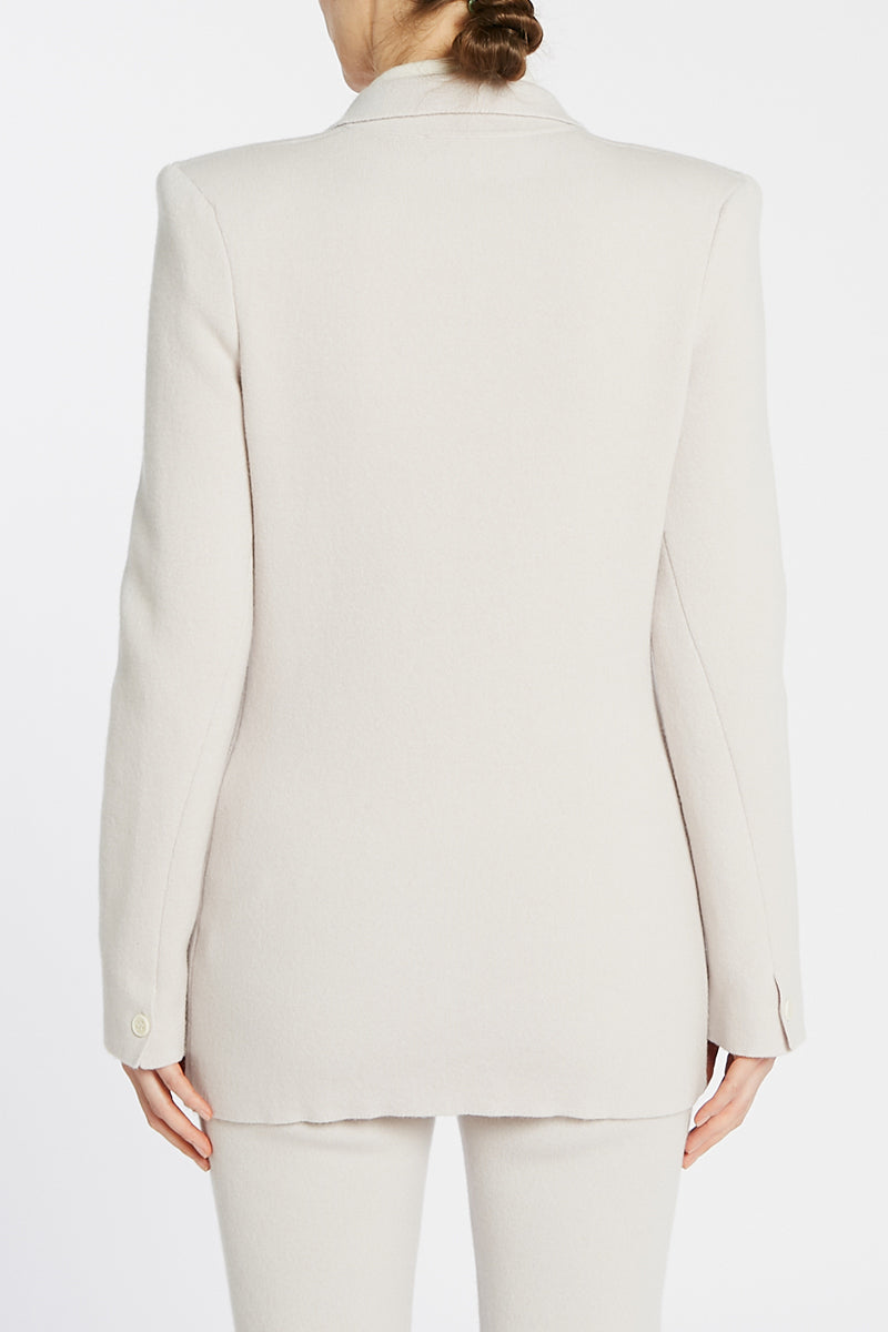 Our cashmere blazer, knitted in interlock stitch laced with elastane for a compact fit that allows it to be neatly 'tailored' with perfect clean edges. Sharp like a tailored jacket. but comfortable like a cardigan.