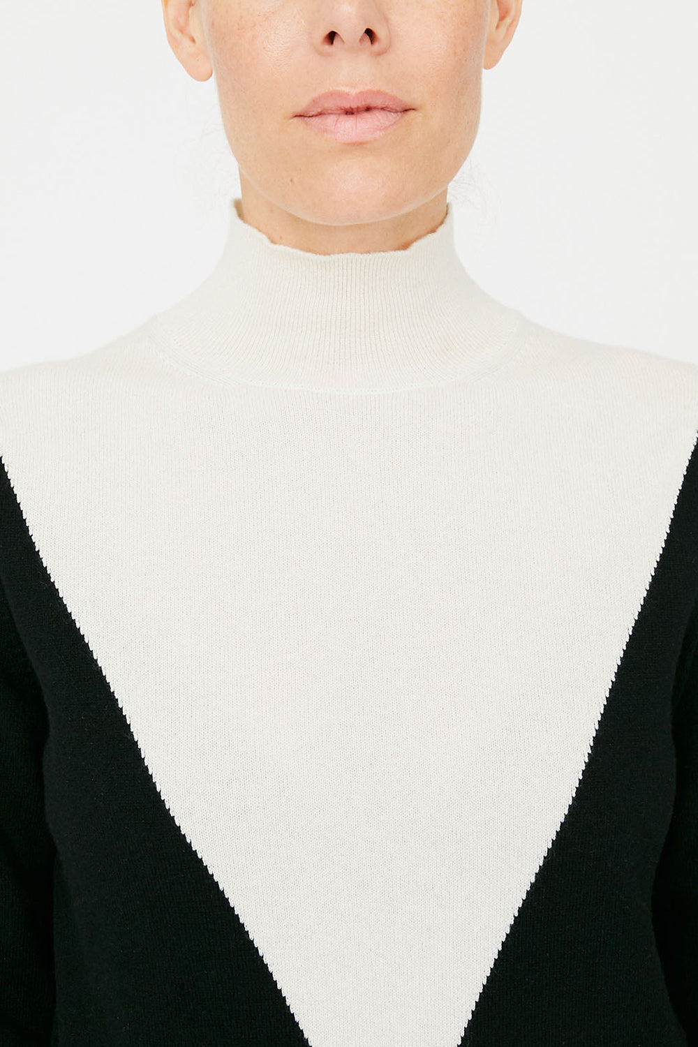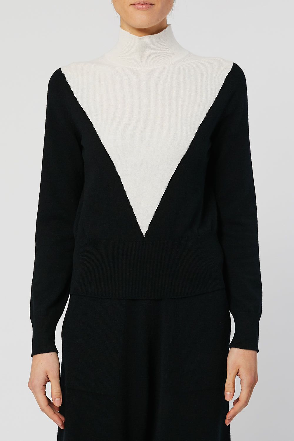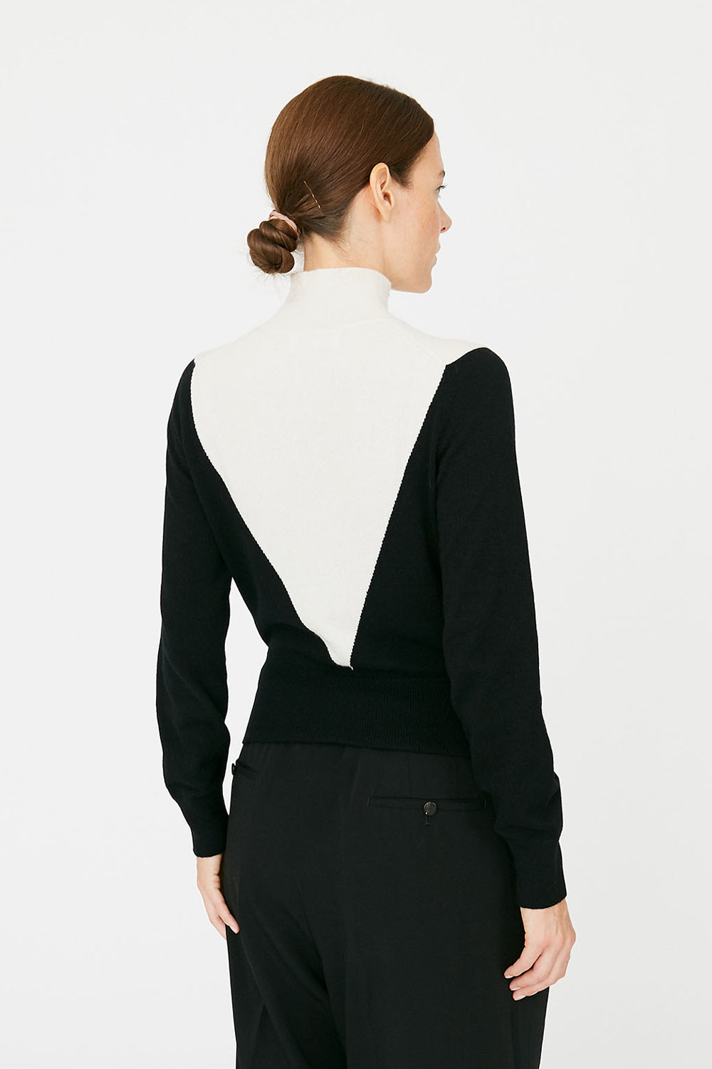 A striking black high neck light cashmere sweater with an ivory V-shaped intarsia panel for pure graphic, monastic elegance. For an instant super-chic upgrade, pair it with black tailored masculine pants.
