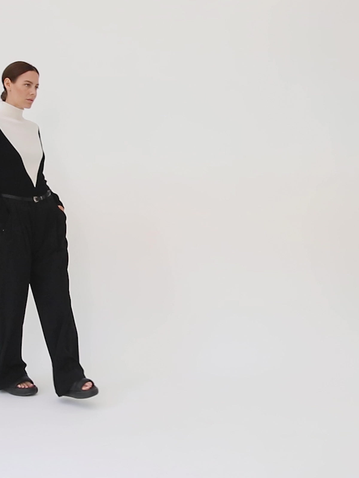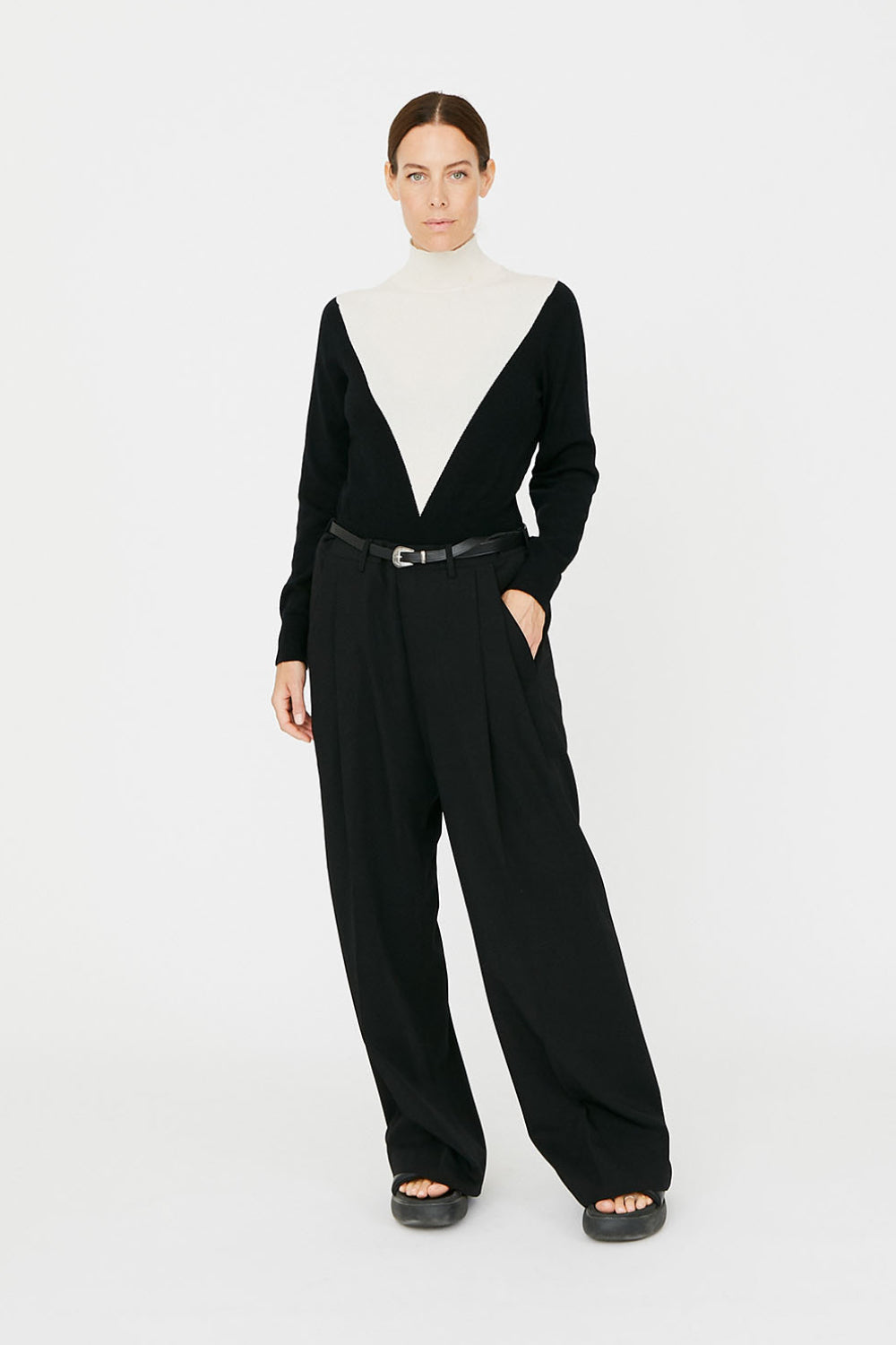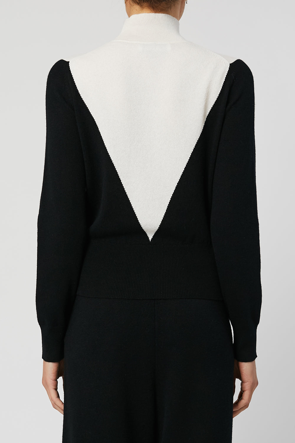A striking black high neck light cashmere sweater with an ivory V-shaped intarsia panel for pure graphic, monastic elegance. For an instant super-chic upgrade, pair it with black tailored masculine pants.