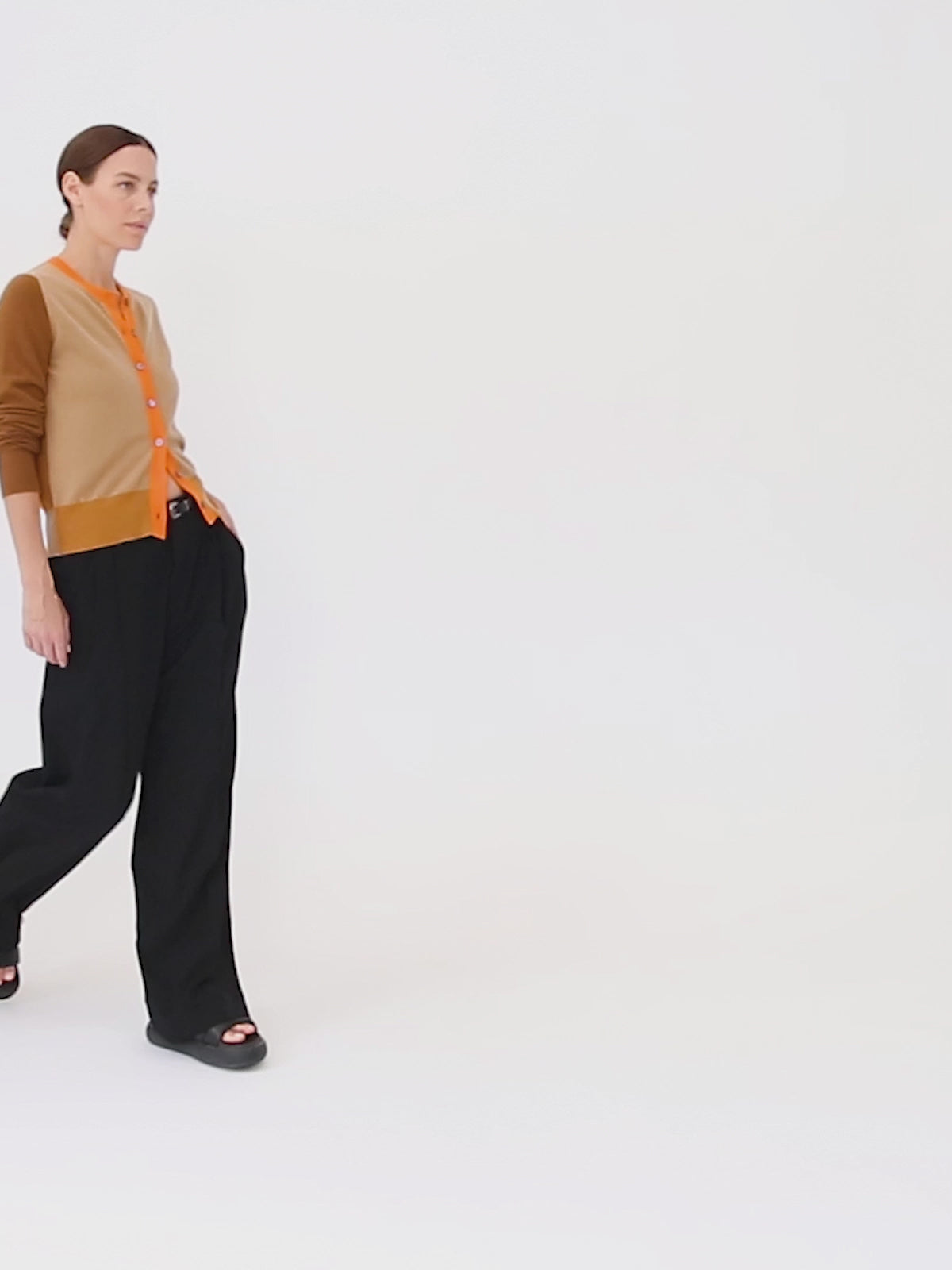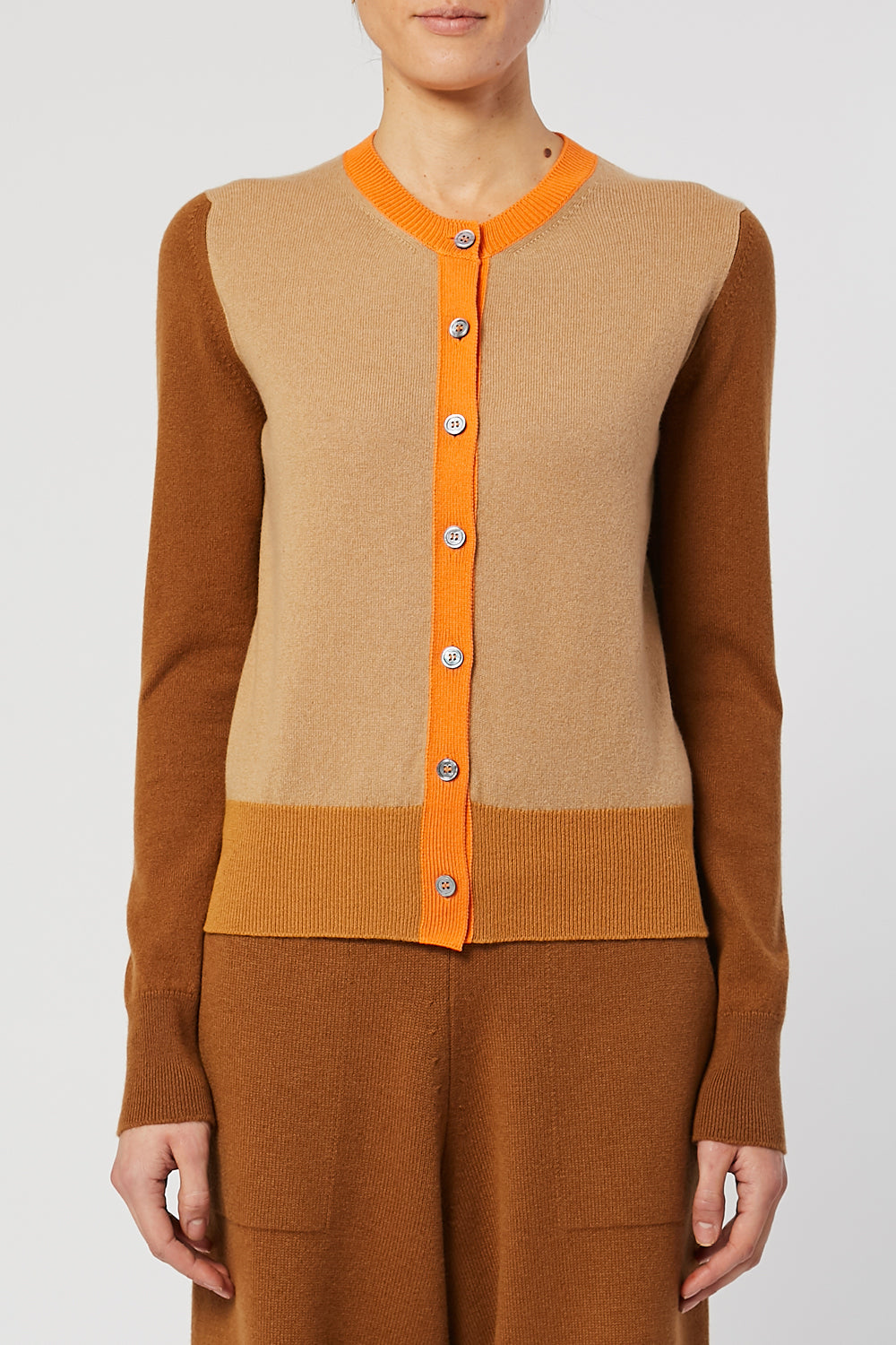 Light cashmere crew neck cardigan, in fresh new proportions and Clements Ribeiro signature way with colours. Camel and Vicuna Brown are zinged with Bright orange in a super chic colour combo.