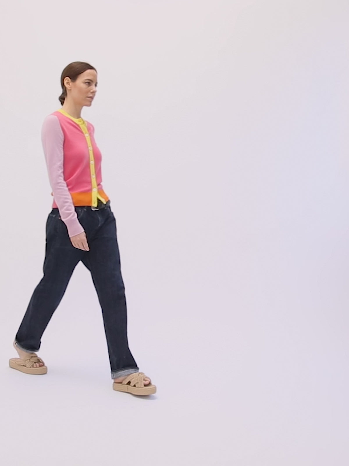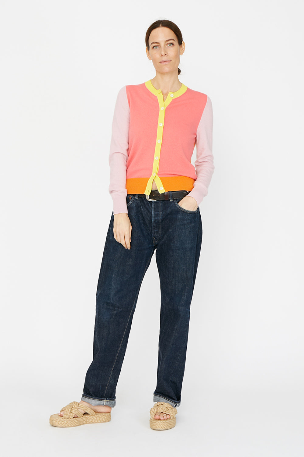 The classic crew neck light cashmere cardigan, cut fresh and in Clements Ribeiro signature colour twist. Complementary colours are zinged with unexpected contrast.