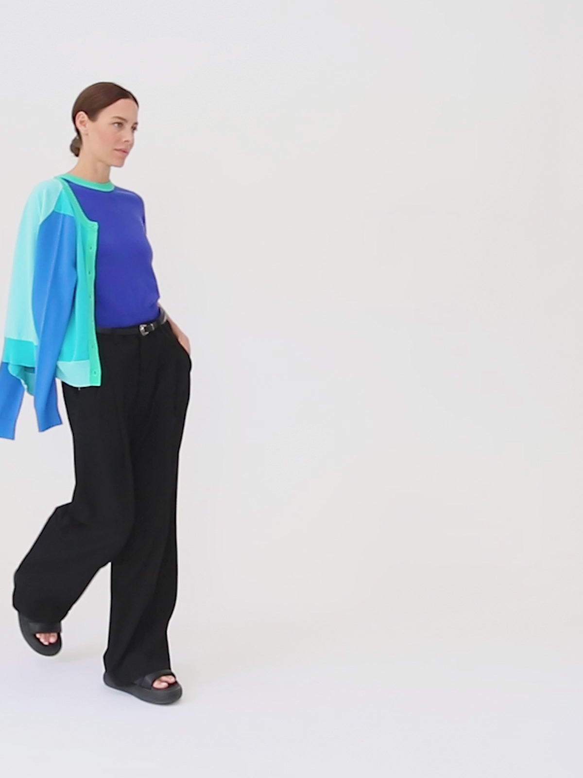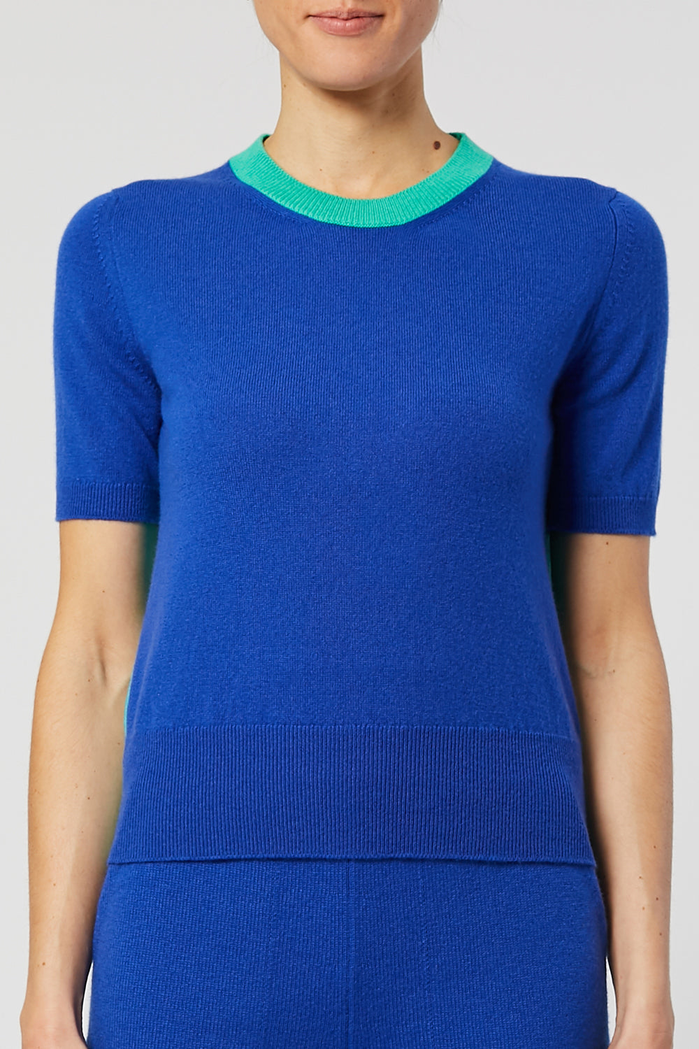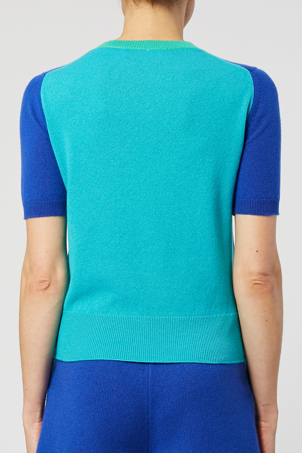 Crew neck short sleeve sweater in signature Clements Ribeiro colourblocking. Light weight cashmere in fresh new proportions. A fantastic staple to lift any outfit. Perfect under a tailored jacket or combining with the matching Baby Spice Cardigan for the a vibrant twinset.